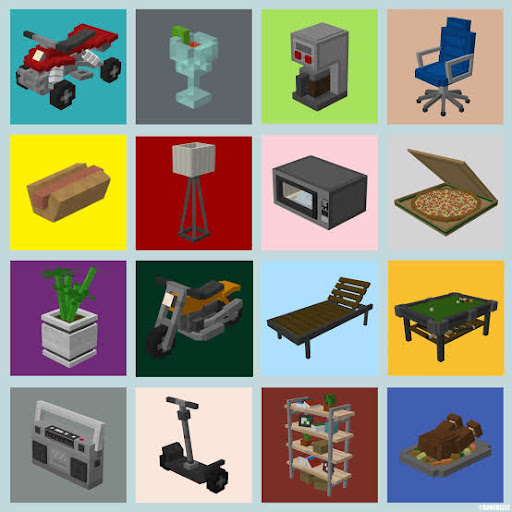 Los nuevos muebles modfor Minecraft PE agregarán muchos muebles para su hogar, como teléfono, cafetera, TV, sofá, chimenea, licuadora, etc. Los nuevos artículos se verán realmente buenos y realistas.Con cosas nuevas, podrá hacer su hogar más cómodo y útil