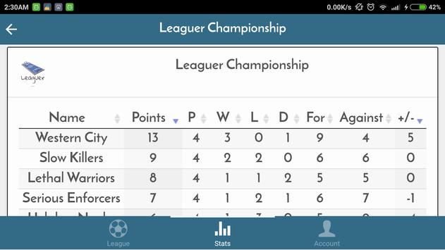 Con nuevas e innovadoras características nunca antes vistas en una aplicación que va más allá de temporización y anotando un juego. Ligas proporciona a los usuarios una plataforma para realizar un seguimiento de cada jugador mueve individuo, añadiendo Objetivos, Guarda, Asistencias, Faltas - lo que le permite incluso realizar un seguimiento de todas las tarjetas amarilla y roja. No sólo es cada estadística en cada juego, redondo y reproductor todo en una aplicación práctica, jugador de la Liga, incluso le permite generar y compartir archivos PDF para todas las estadísticas, tabla de la liga, accesorios redondos y los resultados de la Ronda.