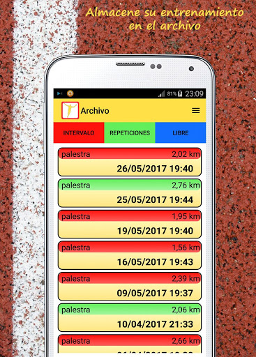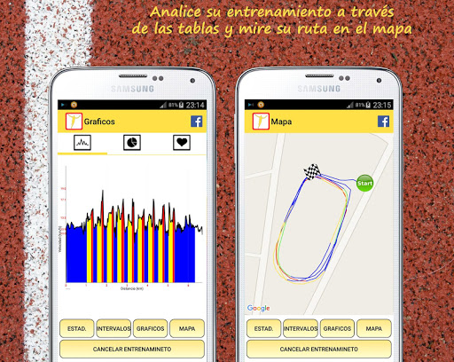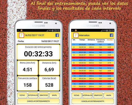 Puede ver la distancia, duración, velocidad y ritmo para cada intervalo, evaluar su ejercicio en los gráficos de velocidad y ritmo, y monitorearlo en el mapa.