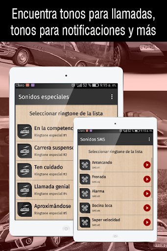 tonos de coches es una app pensada especialmente para tu celular, con una colección genial de ringtones de autos gratis que puedes usar como: tonos de llamadas, tonos de sms, alarma o notificación.