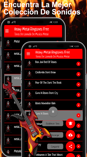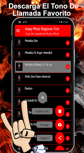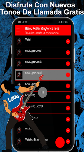 Heavy metal ringtones free para descargar gratis gran selección de tonos de llamada con canciones tradicionales disponibles en todo momento, tonos para compartir, esta App es sencillamente fácil de usar, disfruta del ritmo instrumental para el teléfono con tonos clásicos de metal, Esta App contiene los sonidos más escuchados de música metal para tono de notificación cada uno de los cuales es de alta calidad se puede escuchar y descargar. super colección de ringtones metaleros con las mejores canciones como: metal_gear_rock, Moth Into Flame rehearsal, Vestido de Cristal, Welcome To The Jungle, Californication, Guns N Roses Dont Cry, Metallica The Unforgiven, Nirvana In Bloom, Smells Like Teen Spirit y muchos más.