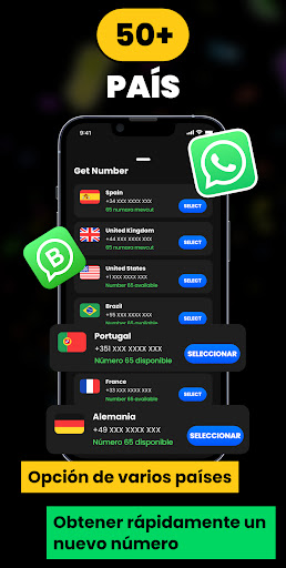 Virtual Number le permite obtener fácilmente un segundo número de teléfono de más de 60 países, incluyendo números dedicados de EE.UU. y Reino Unido para WhatsApp y WA Business.