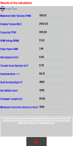El usuario puede seleccionar un ancho de correa estándar de 500 mm a 2400 mm y valores de diseño de entrada y luego pueden verificar los resultados para las funciones en el siguiente paso .