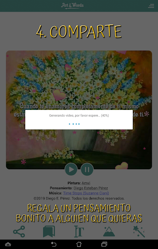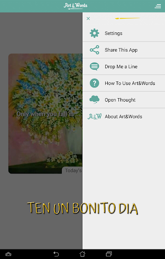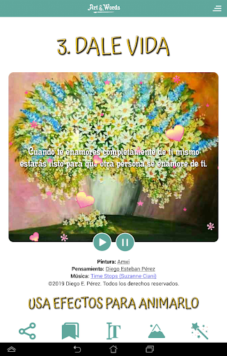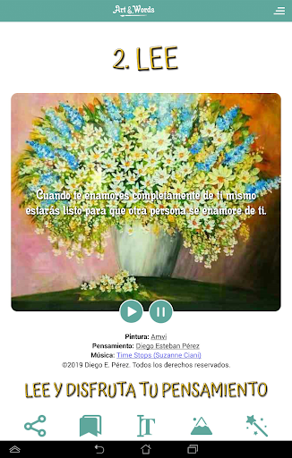 Deseo de todo corazón que esta app pueda llevar algo positivo a quien la use, aunque sólo sea por el pequeño momento qué dedica a leer el “pensamiento del día”, y quiero aprovechar también este espacio para agradecer a Amvi por haber compartido su arte permitiendo que sus bonitas pinturas acompañen a mis escritos.