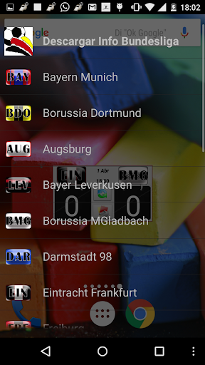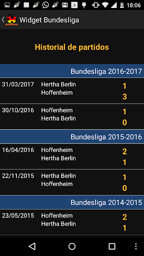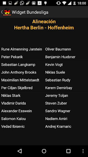 Sigue a tu equipo favorito: Bayer Leverkusen, F. C. Bayern, B. V. Borussia, Borussia Mönchengladbach, Eintracht Frankfurt, F. C. Augsburg, F. C. Köln, Stuttgart, Hamburger S. V., Hertha Berliner S. C., R. B. Leipzig, F. S. V. Mainz, F. C. Gelsenkirchen-Schalke, S. C. Freiburg, Hannover 96, T. S. G. Hoffenheim,