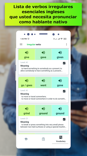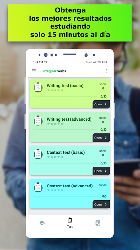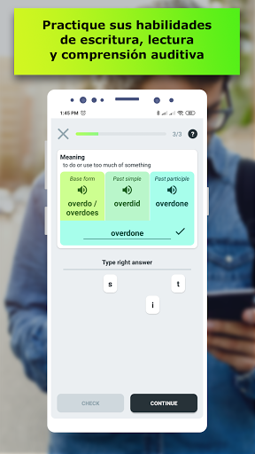 Hay tarjetas didácticas (flashcards) con tiempos verbales en la primera parte de la lección. Usted puede escuchar la pronunciación correcta, ver las definiciones, traducciónes y hasta cinco ejemplos de uso. Si ya conoce este verbo irregular, usted puede omitirlo y continuar con el siguiente. Después de eso, debe pasar una prueba para consolidar los verbos irregulares ya aprendidos para determinar sus puntos más débiles. En la tercera parte de la lección, tiene que escribir todas las formas del verbo usando el teclado aparecido. También puede elegir un objetivo para el día y realizar un seguimiento de su progreso con una interfaz conveniente. Para obtener los mejores resultados y no permitir que se le olvide la repetición, hemos agregado notificaciones.