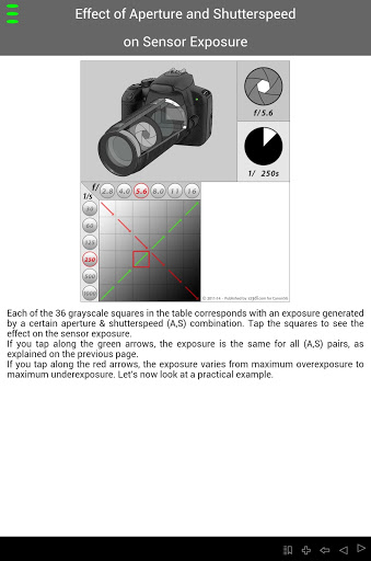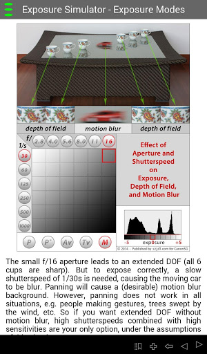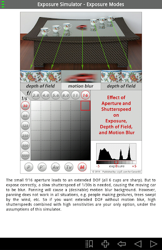 * Tema en profundidad con simuladores interactivos Explicando cómo la abertura y la obturadora afectan la exposición, la profundidad del campo y la falta de definición de movimiento en los diversos modos de exposición.