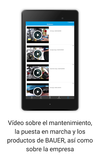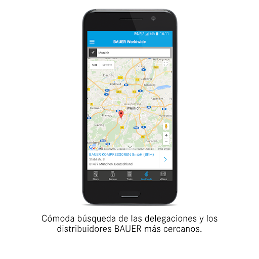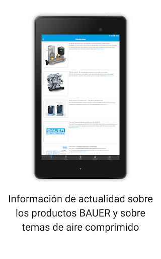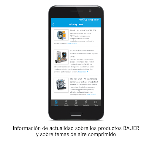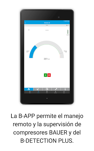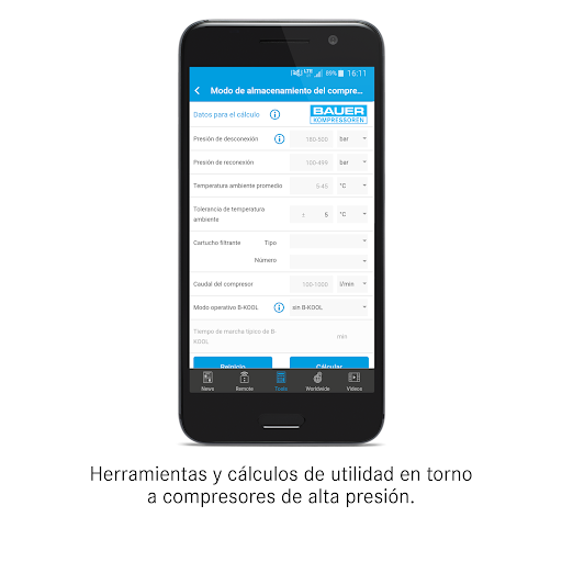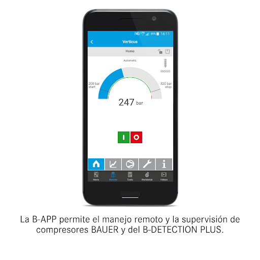 La BAUER KOMPRSESOREN APP (B-APP) ofrece características como noticias específicas de producto, vídeos, una búsqueda de distribuidores integrada y herramientas de cálculo relacionadas con el tema del aire comprimido. Además, la B-APP permite el manejo remoto y la supervisión de compresores BAUER con el nuevo control B-CONTROL MICRO de BAUER.
