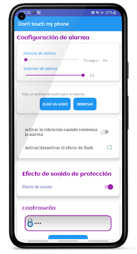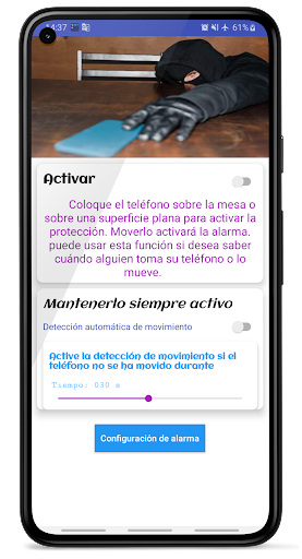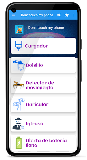 ** Alarma de movimiento: coloque su teléfono sobre la mesa o cualquier superficie plana, cuando alguien intente mover su teléfono, se lanzará un sonido de alarma fuerte de su elección para alertar al ladrón que intenta tomar su teléfono.