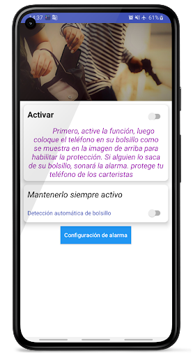 >> Caso de uso: imagina que estás en un autobús o en el mercado con mucha gente a tu alrededor, y tienes tu teléfono en tu bolsillo o en tu bolso y un carterista te lo roba ... cómo podrías saber ¿eso pasa? Ahora, con esta aplicación solo necesita activar el sistema de alarma de bolsillo para que se le notifique en el momento en que el ladrón saque su teléfono de su bolso o bolsillo.