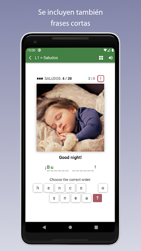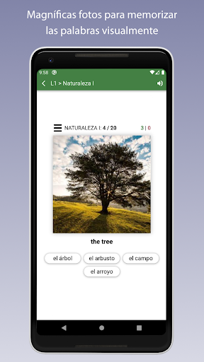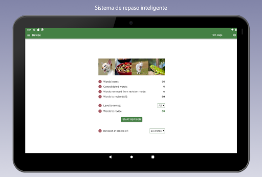 - Sistema de REPASO inteligente que te hará repetir las palabras en función de tus aciertos o fallos. Cuanto más falles una palabra, más a menudo se te preguntará de nuevo para que la acabes memorizando.