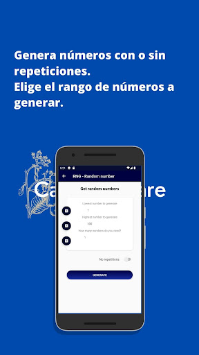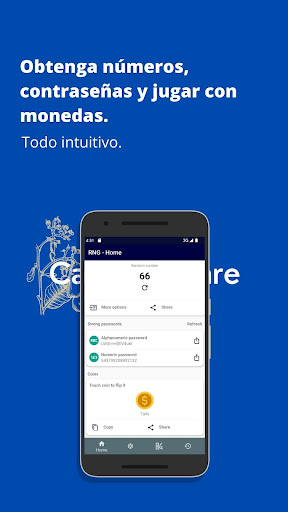 La aplicación Generador de Números Aleatorios está diseñada para dar a los usuarios la capacidad de obtener números generados al azar, contraseñas seguras, códigos QR, números de lotería y lanzar monedas de la suerte. El usuario también puede ver resultados de interacciones pasadas en la pestaña "Historial".