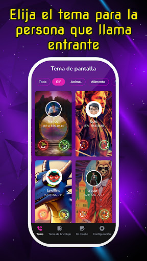 - Nuestra aplicación pantalla de llamada de fondo de pantalla te permite incorporar colores vibrantes y temas animados en tu interfaz de llamadas entrantes. Elija entre una amplia colección de temas visualmente impresionantes que se adapten a su estado de ánimo, estilo o incluso a la ocasión.