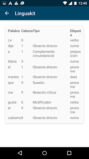 El Analizador Sintáctico de Linguakit evalúa las relaciones sintácticas o de dependencia existentes entre pares de palabras. Así, para cada pareja de palabras define el tipo de relación sintáctica, qué palabra es núcleo y cuál es la dependiente, su categoría gramatical y su posición dentro de la frase.