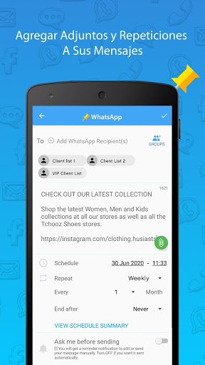 Por ejemplo: programa mensajes de Whatsapp para recordar a tu familia sobre reuniones importantes, trabajos pendientes o para enviar mensajes de cumpleaños a familiares.