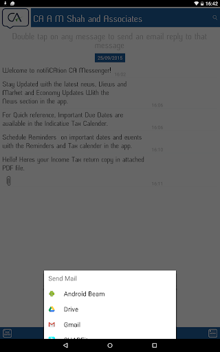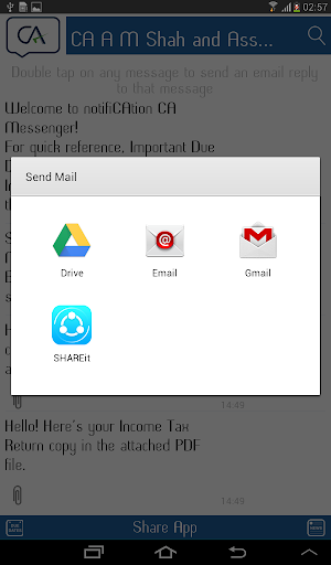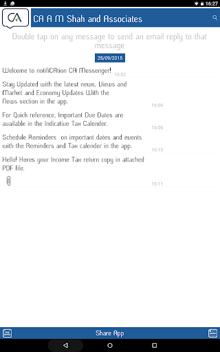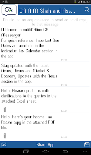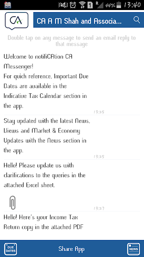 The notifiCAtion CA Messenger is a dedicated mobile messenger app to receive messages & files only from your CA / Accounting professional. With no forwards or messages from any other contacts, your important work-related communication from your CA / Accounting Professional does not get lost amidst any other communication and you can easily refer to it anytime without sorting or filtering messages from other contacts.