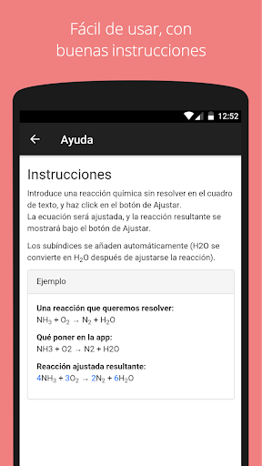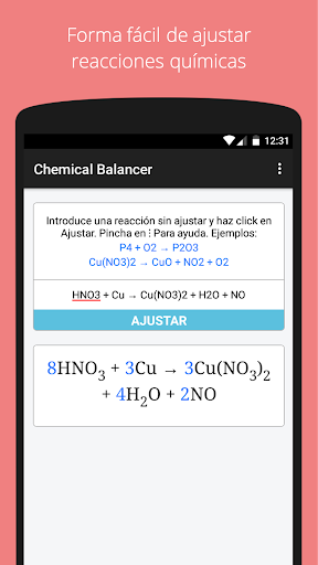 Introduce una reacción química sin resolver en el cuadro de texto, y haz click en el botón de Ajustar. La ecuación será ajustada, y la reacción resultante se mostrará bajo el botón de Ajustar.