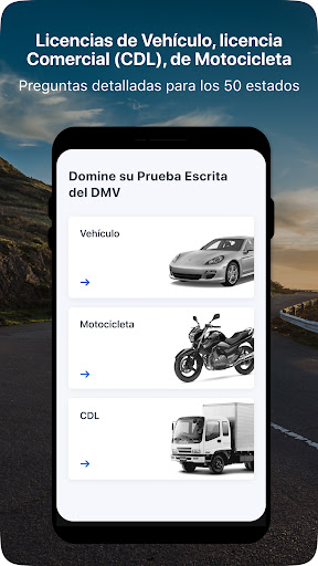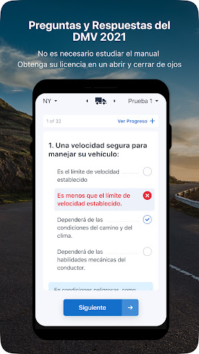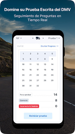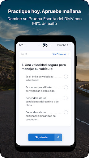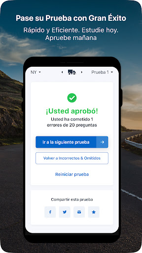 • Practique con Pruebas Exhaustivas: Nuestras pruebas cubren todas las secciones del manual del conductor, por lo que no importa en qué estado se encuentre, usted estará bien preparado. Responda nuestras pruebas de práctica y cuando tome prueba real, le parecerá fácil.