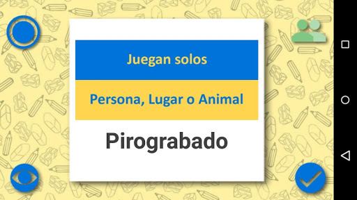• PERSONA, ANIMAL O LUGAR: : Si visualizamos la etiqueta PERSONA, ANIMAL O LUGAR de color AMARILLO, toca representar un dibujo de la categoría "Persona, animal o lugar", incluyen también personajes conocidos. Ejemplos de algunas palabras: Perro, superman, cabaña, Papa.