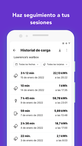 Visualiza gráficos y datos de tu historial de cargas. Descarga facturas o registros de todas tus sesiones de carga.