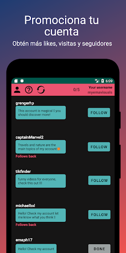 Puedes promocionar su perfil de manera fácil y rápida, descubrir nuevos perfiles, hacerse popular y aumentar tu seguidores y visualizaciones.