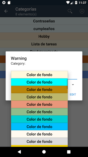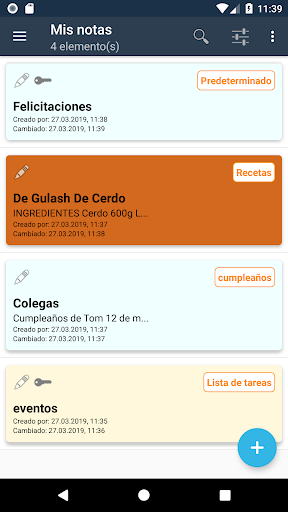 - la capacidad de trabajar con categorías de notas, una transición rápida a favoritos, así como notas de protección de contraseñas y la capacidad de configurar alertas en dichas categorías de notas, como los cumpleaños. La exportación de información guardada le permite utilizarla rápidamente en otras aplicaciones. La aplicación le permite ver archivos de texto de terceros y guardarlos como una nota, así como adjuntar imágenes a la nota.