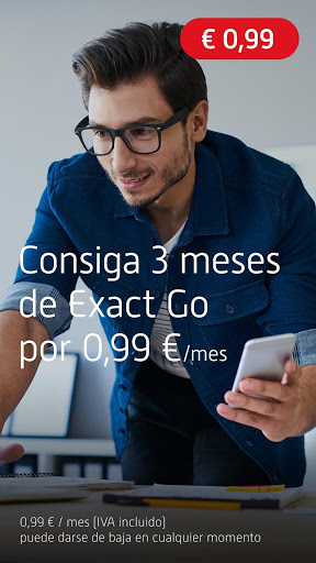 Exact Go: La aplicación acabará con las preocupaciones administrativas de autónomos. ¡Pruébalo gratis durante 30 dias! Consiga 3 meses de Exact Go por 0,99€ / mes (IVA incluido), puede darse de baja en cualquier momento.