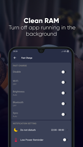 El cargador ultra rápido es muy simple, solo un toque y la aplicación encontrará automáticamente, evaluará y tomará medidas con procesos que usan mucha batería. Puede establecer muchas opciones avanzadas en la configuración de la aplicación.