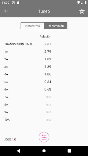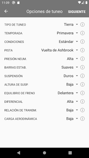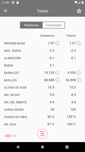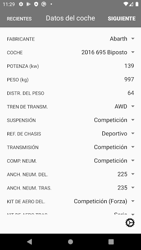 Según los datos proporcionados, se calcula uno tuneo para ese automóvil y tipo de tuneo seleccionado. Los barras estabilizadoras y los muelles se proporcionan con una precisión de 3 dígitos de la fracción, establece los valores del juego en el valor más cercano.