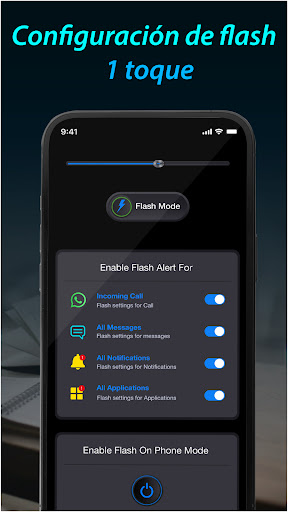 Puede elegir habilitar/deshabilitar flash para mensajes o flash para todas las notificaciones. Seleccione el modo de flash cuando esté en modo silencioso, vibración, normal