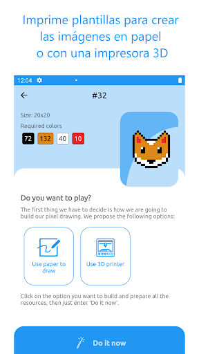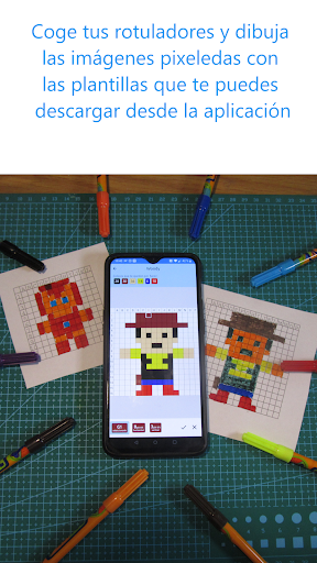 Con esta aplicación podrás crear imágenes pixeladas en el mundo real, nosotros te ayudaremos a crear las imágenes en papel, con una impresora 3D, hama beads o cualquier otra forma que se te ocurra. ¡Sé creativo!