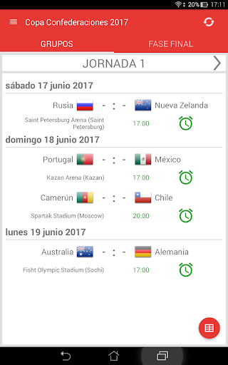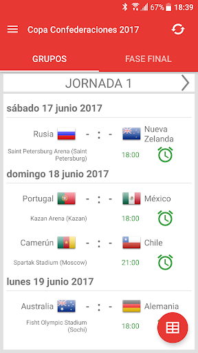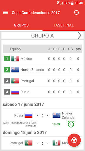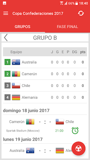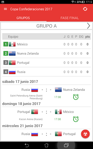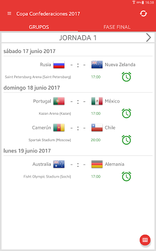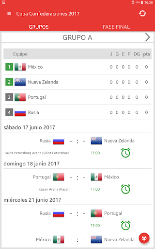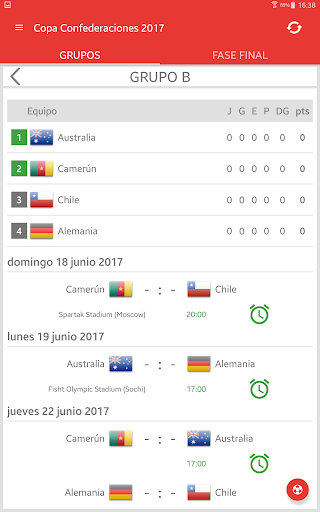 Resultados para la Copa Confederaciones Rusia 2017 es la aplicación que le permitirá seguir los partidos del torneo de fútbol masculino internacional en Rusia, incluso usted no tiene posibilidad de ver la TV o transmitir en vivo. Incluye un calendario de los partidos, una mesa de grupo, resultados en directo y determinará los equipos que se clasificarán en la fase eliminatoria. Con la aplicación no perderá una meta o comenzar de un partido, ya que le enviará una notificación. Puede seleccionar coincidencias favoritas y recibir notificaciones sólo para ellas. En la Copa Confederaciones de 2017 juegan los equipos: Rusia, Alemania, Australia, Chile, México, Nueva Zelanda, Portugal y Camerún.