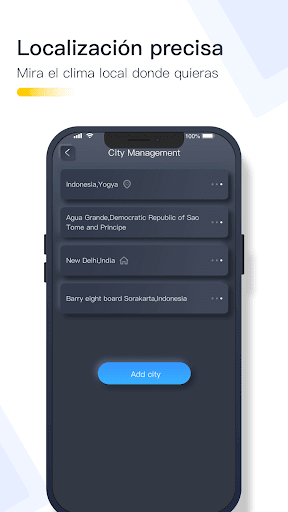-La lista de ciudades te proporciona varios registros de ciudad, cuando quieras ver las condiciones climáticas de otras ciudades, puedes cambiarlas fácilmente.