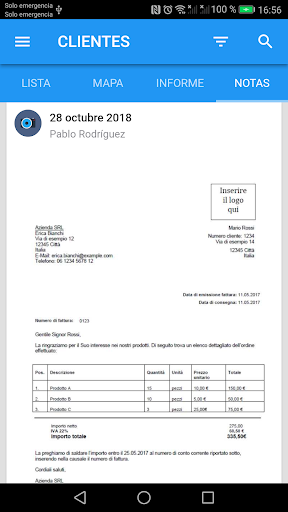 Añadir un cliente nuevo es fácil y directo, inserta sólo los campos que necesites (incluso sólo el nombre). Puedes añadir campos personalizados si los que hay por defecto no son suficiente. También puedes añadir clientes por el camino, el GPS ajustará la ubicación automáticamente.