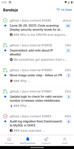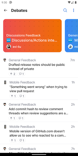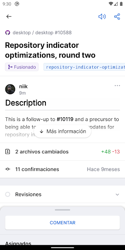 Hay mucho que puedes hacer en GitHub que no requiere un entorno de desarrollo complejo – como hacer sugerencias en una discusión sobre diseño, o revisar algunas líneas de código. GitHub para Android te permite avanzar el trabajo donde quiera que te encuentres. Mantente en contacto con tu equipo, asigna propuestas e incluso fusiona, directamente desde la aplicación. Estamos haciendo que estas tareas sean fáciles de realizar, sin importar dónde trabajes, con una excelente experiencia Android.