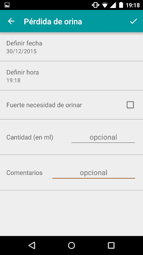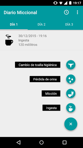 Con este diario podrás registrar tus ingestas diarias de líquido, micciones, pérdidas de orina y cambios de toalla higiénica durante tres días. Luego de haber finalizado el registro para los tres días, podrás enviar un reporte por correo electrónico a tu médico.