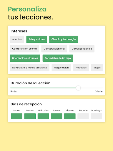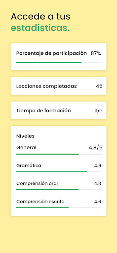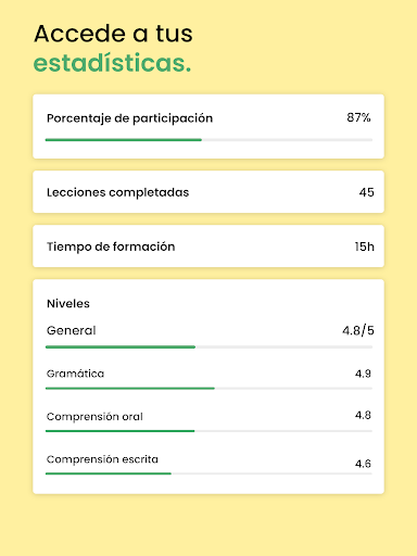 Evalúa tu nivel y obtén un certificado. Nuestra prueba gratuita incluye una evaluación completa de tu nivel de alemán. Sigue tu progreso en tiempo real, ve tus fortalezas y debilidades actuales, los aspectos en los que has mejorado y tus necesidades de revisión futuras.