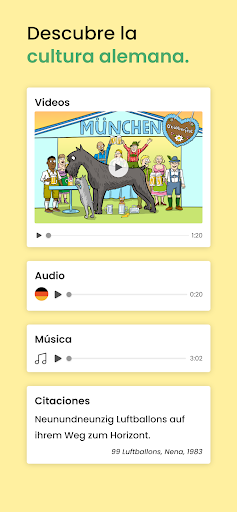 Explora una nueva cultura. Cada lección de alemán termina con un "postre", un fragmento original de un referente de la cultura germanoparlante: cine, música, literatura o televisión para acabar tu rutina con estilo.