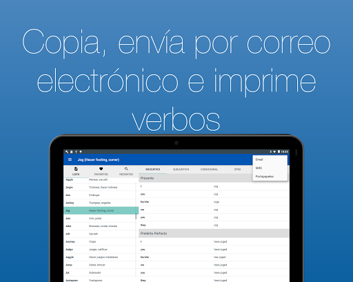 Incluye la posibilidad de copiar las conjugaciones verbales, además de enviarlas por correo electrónico y mensaje SMS.