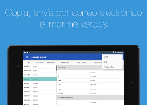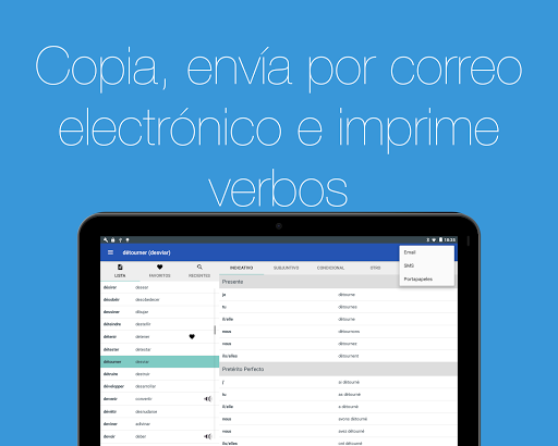 Incluye la posibilidad de copiar las conjugaciones verbales, además de enviarlas por correo electrónico y mensaje SMS.