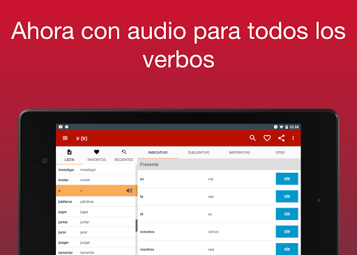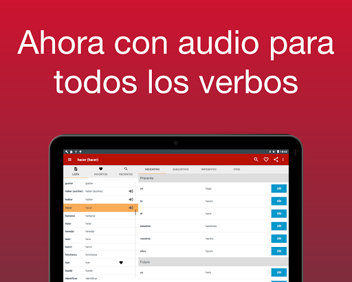 Ahora con audio! No está seguro de cómo pronunciar un verbo? Ahora puedes oír cómo se pronuncia cada verbo. Sólo tienes que pulsar en el botón al lado de la conjugación. Nota: esta funcionalidad requiere una conexión a Internet.