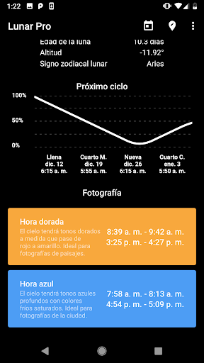- Horarios de la hora dorada y la hora azul disponibles para permitirte calcular cuándo tomar fotos.