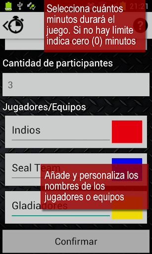 Puedes indicar un límite de tiempo para el juego, o jugarlo indefinidamente. Si indicas un límite, a la finalización la App emitirá un beep e indicará el ganador