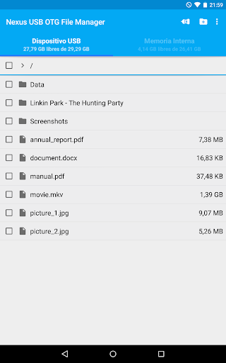 ¡USB OTG File Manager for Nexus le permite abrir sus archivos directamente desde su dispositivo USB! Solo necesita tener una App que lo pueda manejar. Para audio y video, recomiendo utilizar VLC.