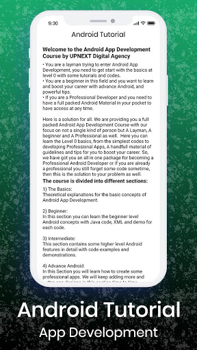 El curso consta de tutoriales, ejemplos de código, demostración y Explicaciones teóricas. Puede aprender conceptos básicos de desarrollo de aplicaciones de Android, conceptos y ejemplos de desarrollo de Android de Nivel para principiantes con código y demostración, características de avance Android con código y demostración, códigos de aplicaciones profesionales de Android con explicación y segmentos de información útil con información importante sobre cómo convertirse en un desarrollador profesional de Android. y el conocimiento sobre diferentes cosas importantes relacionadas con el desarrollo de la aplicación de Android.