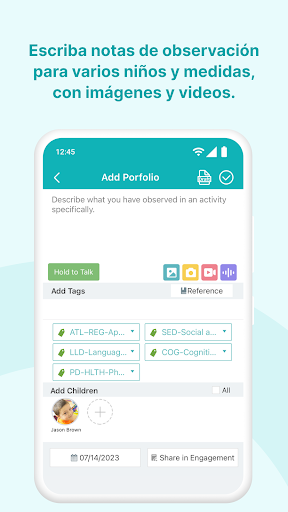 1. Utiliza etiquetas preestablecidas para ayudar a los maestros de preescolar y los proveedores de cuidado infantil a rastrear y organizar las observaciones de desarrollo y las pruebas de evaluación de los niños. Hay un conjunto de normas de aprendizaje temprano incorporadas por país, estado y región que se pueden utilizar; Por ejemplo, US California DRDP 2015 (incluyendo medidas de educación especial), y US Illinois KIDS (evaluación de ingreso a kindergarten), Australia (Early Learning Learning Framework, Queensland Kindergarten Learning Guideline) y Canadá. Para los usuarios de DRDP, ahora puede calificar las medidas directamente en las observaciones de la aplicación. Siempre puede ponerse en contacto con help@learning-genie.com para personalizar y cargar su conjunto personalizado de etiquetas. La herramienta de portafolio también proporciona un resumen rápido de lo que se ha observado y no observado en un período específico de duración para ayudar a los profesores a mantenerse justo en camino.