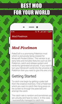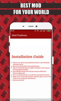 Mod Pixelmon for MCPE - the best mod, which we create for You. This app give You the most popular mod Pixelmon for fun playing. This application will help You to install presented mod by Easy Instructions. Caution: This application created by fans for fans. We are not a manufacturers (Mojang AB) or subsidiary of Minecraft Pocket Edition.