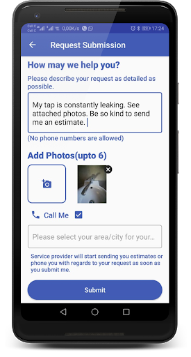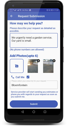 Lo que hemos hecho es desarrollar una aplicación que haga su solicitud frente a los proveedores de servicios correctos.Los proveedores de servicios pueden proporcionarle una estimación y también tendrá la opción de solicitar una llamada.Un sistema de calificación también se incorpora a la aplicación para que pueda ver las calificaciones anteriores que han recibido. ¡Esta es una situación de ganar-ganar tanto para clientes como para proveedores de servicios.Esto hará que sea mucho más fácil para ambas partes recibir una respuesta rápida de los clientes y los proveedores de servicios.
