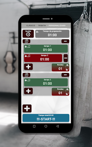 - configurar el tiempo de preparación, el tiempo de trabajo y descanso, los ciclos, así como también puede configurar su propio temporizador