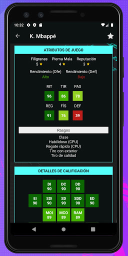 En la pantalla de Detalles de Jugador, eres capaz de mostrar datos muy detallados como Foto del Jugador, Nombre Completo, Posiciones Preferidas, Fecha de Nacimiento, Altura, Peso, Fecha de Expiración de Contrato, Sueldo, Valor, Cláusula de Rescisión, Especialidades, Rasgos, Pierna Mala, Filigranas, Rendimientos y Clasificación de Jugadores Por Posiciones.